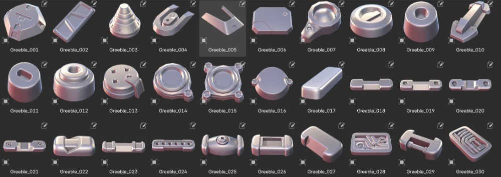 One of the assets you'll receive with the course is a greebles kit for kitbashing additional detail. These are all carefully crafted UV-unwrapped and subdivision-ready meshes. They are marked as assets, so they can be easily added to your asset browser and dragged and dropped into the scene.